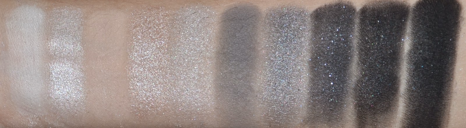 These swatches are using ELF Eyelid Primer as included. The colours are not performed best on the primer itself.. Most shadows are chalky, quite a lot of falls out except the deep purple and black. These 2 shades are a bit stiff on the pans but can work well on the eyelids.